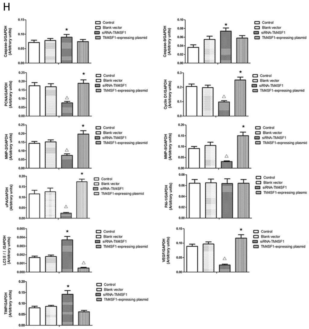 Human liver cancer cells (HepG2 cells) were provided by the Department of Infectious Diseases of the Affiliated Xiangya Hospital of Central South University. TM4SF1-expressing plasmids were prepared by Shanghai Genepharma Co., Ltd. (Shanghai, China). Lipofectamine® 2000 and the Trizol reagent were from Invitrogen (Carlsbad, CA, USA); RPMI-1640, trypsin, fetal bovine serum (FBS), and G418 were from Gibco (Grand Island, NY, USA); monoclonal antibodies against TM4SF1, MMP-2, PAI-1, uPA, TIMP, and PCNA were from Abcam (Cambridge, UK); monoclonal antibodies against caspase-9 and caspase-3 were from Bioss (Woburn, MA, USA); monoclonal antibodies against LC3I/II and cyclin D1 were from Cell Signaling Technology (Danvers, MA,USA); monoclonal antibodies against MMP-9 were from ProteinTech Group (Chicago, IL, USA); monoclonal antibodies against GAPDH were from Santa Cruz Biotechnology (Dallas, TX, USA); Transwell assays and matrigel were from BD Biosciences (San Jose, CA, USA); ultraSensitive TM-SP was from Fuzhou Maxim Biotech Co., Ltd. (Fuzhou, China); and ECL+ was from Amersham (Piscataway, NJ, USA).