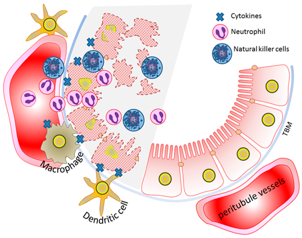 The immune system has an essential role in regulating many immune response-mediated pathologies during disease progression. This role includes the stepwise stimulation of innate immune responses with subsequent cytokine release and crosstalk between renal cells and immune cells, mainly dendritic cells and macrophages, for tissue injury resolution. It also includes adaptive immune responses with evident participation of T cells in tissue injury and repair [33].