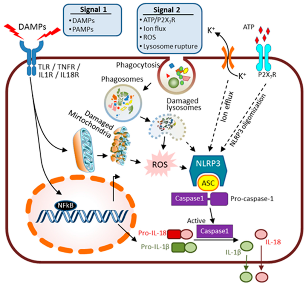 Inflammasome signaling acting in a two-step activation of IL-1β and IL-18. Activation of the NLPR3 inflammasome requires two signals. Signal 1 involves the activation of TLRs, IL-1R, IL-18R and TNFRs by DAMPs or PAMPs which then induces the transcriptional activation of NF-κB and subsequent production of pro-IL-1β and pro-IL-18; Signal 2 involves different pathways such as ion (K+) efflux, generation of ROS, ATP/P2X7R activation and lysosomal rupture/release of the endogenous cathepsins into the cytosol. Both signals coordinately induce assembly of the inflammasome complex: NLRP3 (sensor), apoptosis-associated speck-like (adaptor) and recruitment and enzymatic cleavage/activation of active caspase-1. Activated caspase-1 cleaves pre-forms of pro-IL-1β and pro-IL-18 to release the pro-immunogenic IL-1β and IL-18. Solid arrows indicate direct activation; dashed arrows indicate indirect activation.