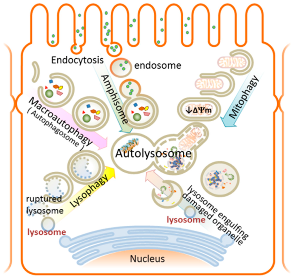 Lysosomes are intracellular membrane-bound acidic (about pH 4.5) organelles containing more than 50 kinds of hydrolytic enzymes known as “cathepsins” capable of degrading biomolecules such as proteins, nucleic acids, lipids and cell debris. During lysosome rupture, the lysosomes release large amounts of cathepsins, proteins, and calcium into cytosol, which result in apoptotic cell death, caspase activation and cellular dysfunction. Evidence demonstrated that damaged lysosomes are selectively sequestered by macroautophagy [104,113] (Figure 3). It is known that proximal tubule-dependent receptor-mediated endocytic vesicular trafficking and lysosomal degradation (clearance) are crucial to renal protein reabsorption and clearance [114]. Indeed, reabsorption of filtered proteins is largely limited by the capacity of lysosomal degradation instead of receptor-mediated endocytosis [115]. Moreover, it has recently been shown that the numbers of lysosomes are functional or dysfunctional, remain constant within cells [113], and that ruptured lysosomes are a strong activator for NLRP3 inflammasome [61]. Thus, maintaining cellular homeostasis with lysosome-selective lysophagy becomes especially important in AKI. In line with this finding, Maejima et al. [113] have reported proximal tubule-specific autophagy-deficient mice demonstrating severe nephropathy under hyperuricemia-induced lysosome rupture in kidney. Interestingly, it seems there is mitochondrial and lysosomal crosstalk in the regulation of cisplatin-induced nephrotoxicity [116]. It would be of great value to study the crosstalk between mitochondria and lysosomes in the setting of animal AKI models in real time using high resolution multiphoton microscopy.