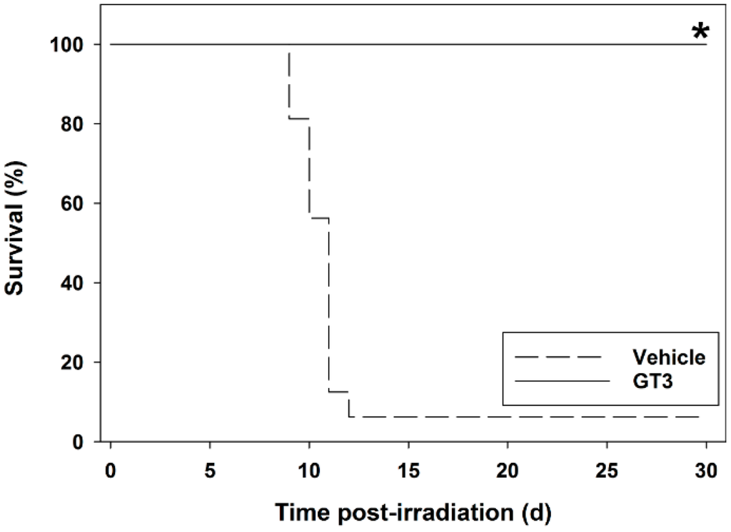 GT3’s antioxidant activity was a compelling reason to evaluate it for its radioprotective efficacy. Studies have shown that a single subcutaneous administration prior to whole body irradiation is capable of dramatically decreasing radiation injury in several organ systems, including the GI, the hematopoietic system and the vascular system. In fact, after a radiation dose that is uniformly lethal within 14 days, mice receiving a single dose of GT3 24 h prior to irradiation show near 100% long-term survival (Figure 2). Comparatively, GT3 appears to be the most promising tocol tested as a radiation countermeasure to date.