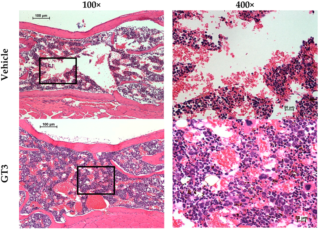 The efficacy of GT3 administration on sternal cellularity and megakaryocytes in mice exposed to ionizing radiation. Two groups of mice were administered subcutaneously the vehicle or GT3 (200 mg/kg) 24 h prior to irradiation. Mice were exposed to 9.2 Gy (0.6 Gy/min) whole body γ-radiation. Sterna from mice were harvested 6 h after irradiation. Cross-sections of sterna were processed for tissue fixation, and sternal bone marrow cells were stained (H&E) to score cellularity. Representative areas of cross-sections are shown (left panels, 100×; right panels are the marked enlarged area from respective left panels of each photomicrograph at 400× magnification) [70].