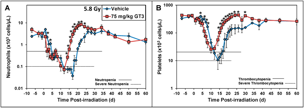 Effects of radiation exposure and GT3 treatment on the levels of neutrophils and platelets in peripheral blood of irradiated nonhuman primates (NHPs). Animal received GT3 (75 mg/kg, red) 24 h prior to irradiation. The vehicle control is colored blue. NHPs were irradiated with 5.8 Gy (0.6 Gy/min, cobalt-60 γ-radiation), and blood samples were collected at various time points in relation to irradiation. Neutrophils (A) and platelets (B) were analyzed with the Advia 120 cell analyzer. The mean and the standard error of the mean are displayed. The significant differences between GT3- and vehicle-treated groups are marked with * (p < 0.05) [69].