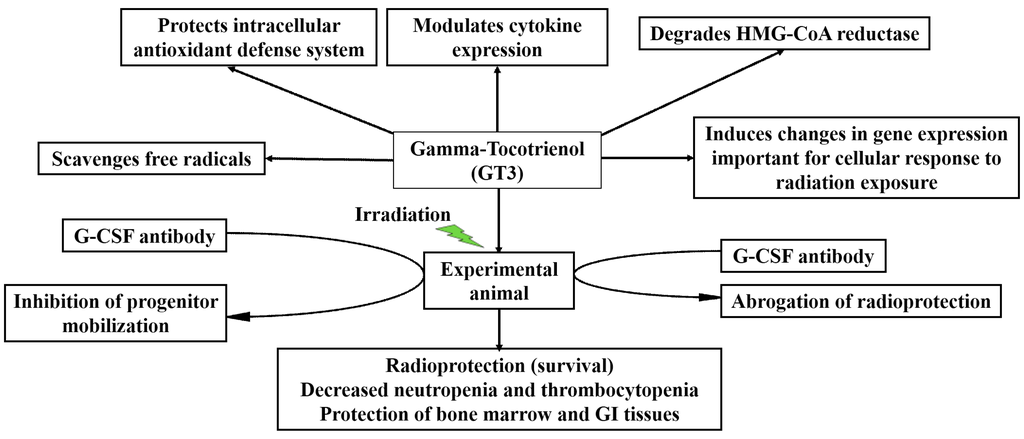 In order to investigate the radiomitigative potential of progenitors mobilized by GT3, experiments were performed where mice exposed to a high radiation dose (11 Gy) received administration of GT3-mobilized progenitors from donor mice. Administration of blood or mononuclear cells from peripheral circulation significantly enhanced survival of the lethally-irradiated mice [87]. Furthermore, the irradiated mice receiving peripheral blood mononuclear cell administration from GT3-injected donor mice retained GI structural integrity and had significantly reduced incidence of bacterial translocation from the GI tract to peripheral blood circulation and other organs. This suggests that such blood transfusions or mononuclear cell administration also provide GI recovery in addition to hematopoietic recovery in irradiated mice. These benefits were significantly abrogated by the administration of G-CSF antibody to the donor mice. Such antibody administration neutralized the GT3-induced G-CSF, ultimately inhibiting the mobilization of sufficient bone marrow progenitor cells for optimal mitigation of radiation injury. In brief, the capacity of GT3 to mobilize bone marrow progenitors can be used for the treatment of radiation injuries. Mobilization of bone marrow progenitors into peripheral circulation by GT3 suggests that GT3 can be substituted for G-CSF and vascular endothelial growth factor to mobilize progenitors in the peripheral circulation. Such a treatment option appears to be really attractive based on preliminary studies in the mouse model with another tocol, tocopherol succinate [85,88,89].