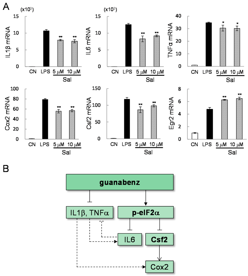 2.3. Guanabenz-Driven Downregulation of Egr2 and Csf2 in Lipopolysaccharide (LPS)-Stimulated Cells