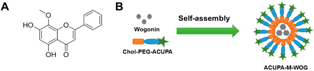 Figure 1. (A) The chemical structure of wogonin; (B) Schematic representation of self-assembled 2-(3-((S)-5-amino-1-carboxypentyl)ureido)pentanedioic acid (ACUPA) modified polyethylene glycol (PEG)-Cholesterol micelles containing wogonin (WOG) (ACUPA-M-WOG).