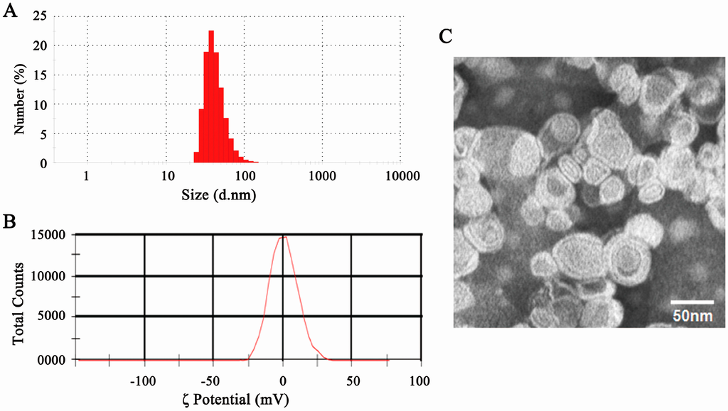The synthesis route of ACUPA-PEG-Chol is referenced in previous reports and some modifications are made [24,30]. Figure 2 presents the 1H nuclear magnetic resonance (1H NMR) spectrum of ACUPA-PEG-Chol and some intermediates, ACUPA and PEG-Chol, which means ACUPA-PEG-Chol is successfully synthesized. The large peak at about δ 3.5 ppm (a) shows the methylene group in PEG, which contains repeating ethylene glycol units; only PEG-Chol and ACUPA-PEG-Chol exhibit this peak. The multiple peaks from δ 0.6 to 1.2 ppm (b) are assigned to the protons of cholesterol scaffold, and the dd peaks at around δ 2.6 ppm (c) show the methylene proton of the succinyl group. The multiple peaks around δ 2.0 ppm (d) are assigned to the methylene of the glutamate group in the ACUPA fragment, and the adjacent two single peaks at δ 1.40 and 1.38 ppm (e) are assigned to the tert-butyl ester group in the ACUPA fragment. These results further show that the conjugate has reacted well and target molecule was successfully synthesized.In general, the preparation of ACUPA-M-WOG is utilized a self-assembly method, and the mean size of wogonin loaded micelles is about 24 ± 5 nm (Figure 3A), with an optimal drug/polymer (w/w) ratio of 1:19, and optimal drug loading (DL) and entrapped efficiency (EE) of 4.8% ± 0.2% and 95.8% ± 2.6%, respectively. Moreover, the polydisperse index (PDI), and ζ potential of WOG-loaded ACUPA-PEG-Chol micelles are 0.27 ± 0.03, and 0.6 ± 1.4 mV, respectively (Figure 3B). The transmission electron microscopy (TEM) image of ACUPA-M-WOG is demonstrated in Figure 3C, which implies that the ACUPA-M-WOG is nearly spherical in shape and its diameter is about 30 nm. The results of particle size and microscopic structure of micelles tested by TEM prove the stable and homogenous ACUPA-M-WOG aqueous disperse can be achieved by loading WOG into AUPA-PEG-Chol amphiphilic polymeric micelles.