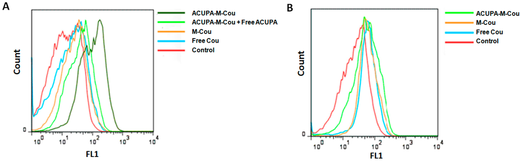 The LNCaP and PC-3 cells are incubated with micelles containing coumarine-6 (Cou), to evaluate whether the increased drug uptake of ACUPA is modified by prostate cancer cells. After incubation of free coumarine-6, M-Cou and ACUPA-M-Cou with or without ACUPA for a certain time interval are washed with PBS twice. Then, the cells are collected and flow cytometry is used to detect the fluorescence, which is derived from coumarine. The result (Figure 4A) shows the fluorescence intensity in LNCaP cells incubated with ACUPA-M-Cou, ACUPA-M-Cou plus free ACUPA, M-Cou, free coumarine-6 and PBS. The mean fluorescence intensity of ACUPA-M-Cou group cells is 4.3-fold stronger (mean fluorescence intensity = 5. 4 vs. 23.2, p < 0.05) than that of the M-Cou group (Figure 4A); this result suggests that the ACUPA fragment indeed increases the uptake of the micelles in PSMA-positive PCa cells. Moreover, when the free ACUPA is added in the culture beforehand, the uptake increase of the ACUPA-M-Cou group is eliminated, which suggests that the binding of ACUPA to PSMA occurs in a competitive manner. In Figure 4B, on the PSMA negative PC-3 cells, there are no significant differences in mean fluorescence intensity of ACUPA-M-Cou, M-Cou and free Coumarine-6 groups, which further reveals the ability of ACUPA-M-Cou micelles to target PSMA positive PCa cells relies on the ACUPA fragments binding to PSMA.