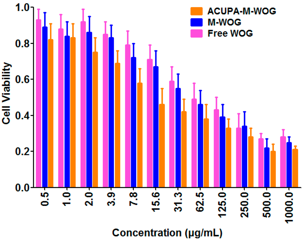 Figure 5. The cytotoxicity of the free WOG, M-WOG, and ACUPA-M-WOG on LNCaP in vitro. The cell viability is quantified by MTT through detecting the percentage of viable cells. Mean values and 95% confidence intervals are shown, which are depended on three independent experiments.