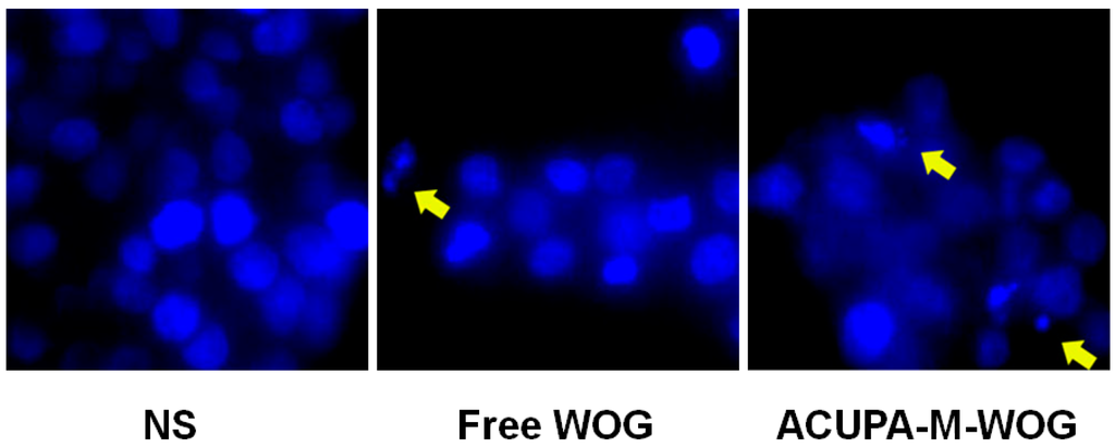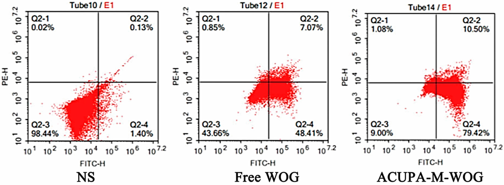 The apoptosis-inducing activities of ACUPA-M-WOG, M-WOG and free WOG to LNCaP cells were tested on a flow cytometry. Briefly, LNCaP cells were cultured in 6-well plates for 24–48 h, and then the cells were exposed to DMEM culture containing ACUPA-M-WOG, M-WOG or free WOG for an added 48 h, respectively. Then, cells were digested with trypsin, washed by PBS and stained with Annexin V/Propidium Iodide (BD PharMingen, San Diego, CA, USA). Both early apoptotic and late apoptotic cells were counted by flow cytometry in cell apoptosis determinations. Annexin V+/PI cells meant early apoptotic cells, while Annexin V+/PI+ cells meant late apoptotic cells.