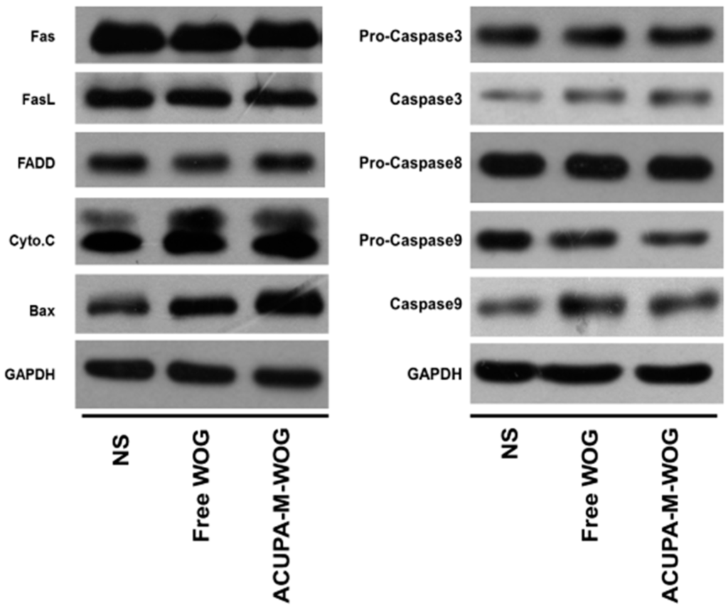 Figure 8. Free WOG or ACUPA-M-WOG induces apoptosis through the intrinsic pathway in PSMA (+) LNCaP cells, which is verified by WB (Western blot). GAPDH (glyceraldehyde phosphate dehydrogenase) served as a control.