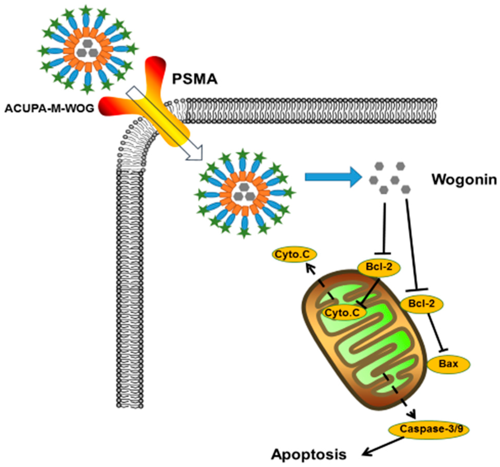 In conclusion, PSMA-positive PCa-targeted polymeric micelles, which are modified with ACUPA on the surface, have been an effective strategy for targeted chemotherapy. The prepared ACUPA-M-WOG not only has small particle size, but also good physico-chemical stability. In vitro experiments suggest that compared to a free drug or blank micelle, ACUPA-M-WOG shows stronger cytotoxicity in vitro proliferation assays and induces more apoptosis in PSMA-positive PCa cell lines. Moreover, flow cytometry analysis indicates that the surface ACUPA fragment of ACUPA-M-WOG promotes the selective uptake by LNCaP cells which are PSMA positive. Furthermore, the mechanism study of ACUPA-M-WOG demonstrates that the targeted micelles enhance the therapeutic efficiency of WOG, mainly in a manner dependent on inducing intrinsic apoptosis. Based on these, ACUPA-M-WOG may be an effective strategy for a prostate-cancer-targeted drug delivery system.
