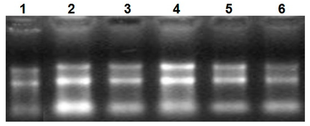 Figure 1. The electrophoretogram of RNA. From1 to 6, the results represent heart tissue, liver tissue, small intestine tissue, longissimus dorsi tissue, hind shin tissue, adipose tissue, respectively.