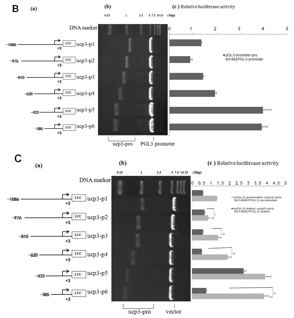 Figure 5. Analysis of the cattle UCP3 promoter. (A) Analysis of activity of pGL3-basic-ucp3-pro/pGL3-basic and pGL3-promoter-ucp3-pro/pGL3-basic; (B) Analysis of activity of of pGL3-promoter-ucp3-pro/pGL3-basic and pGL3-promoter-ucp3-pro/pGL3-promoter. (a) Schematic diagram of the ucp3 promoter constructs consisting of the 5′-flanking region with serial deletions cloned into the pGL3-basic and pGL3-promoter vector. The arrows show the direction of transcription. The numbers represent the end points of each construct; (b) The deletion plasmids were digested by the restriction enzyme and run on a 1.5% agarose gel. The size of vector is 4.8 kb. The inserted fragments of the ucp3 promoter range from 389 to 1086 bp which are confirmed by sequencing; (c) The deletion plasmids were cotransfected with pGL3-basic and pGL3-promoter into C2C12 cells; the cells were harvested 24 h later after transfection and luciferase activity was measured and expressed in relative luciferase units (RLU).