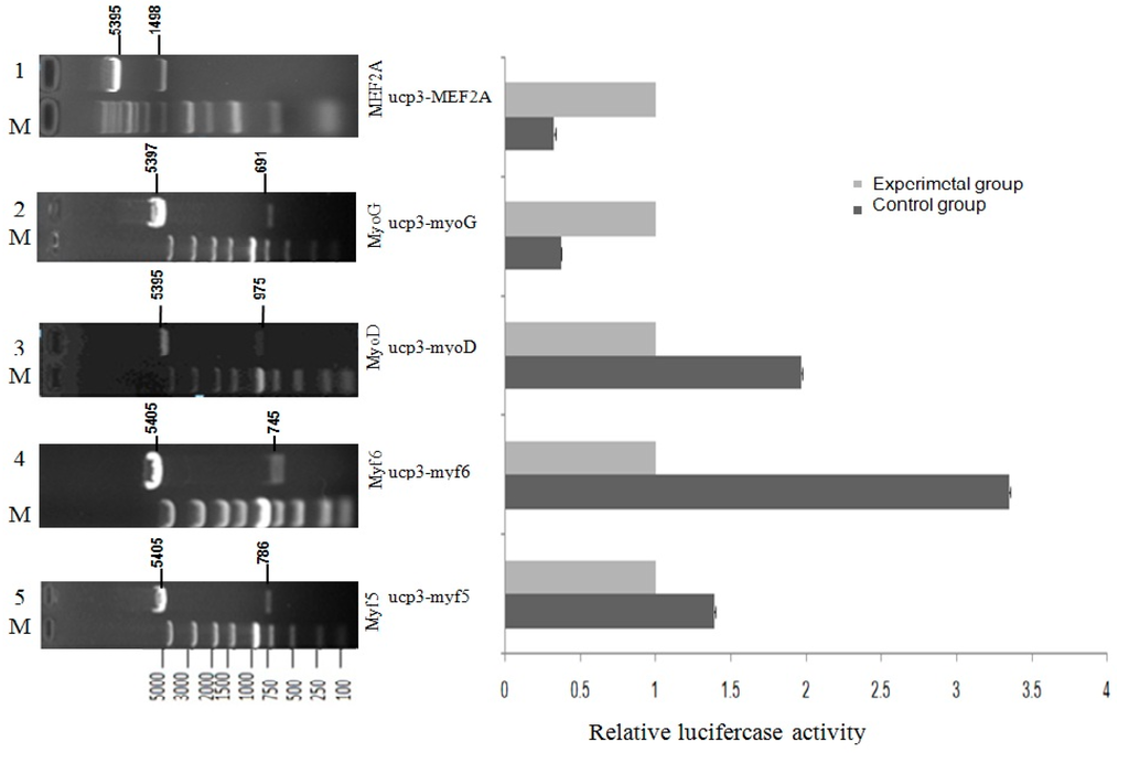 Guanling cattle are a yellow-coated breed that was developed in China [16]. In this study, 5′ upstream regions of UCP3 of Guanling cattle were analyzed, and PCR amplified segments of different length UCP3 gene promoter sequences, different length fragments of UCP3 promoter activity and the core of UCP3 promoter were tested. Transcription factor binding sites of cattle UCP3 promoter were screened using Promoter-Binding transcription factors (TF) Profiling assay combined with bioinformatics analysis, and we identified several transcription factor binding sites for UCP3. We investigated whether the UCP3 promoter activity could be increased by myogenic regulatory factors (MRFs) family and myocyte-specific enhancer factor 2A (MEF2A) transcriptional factors. These results of cattle UCP3 promoter provide a platform for further researche on promoter activity and expression regulation. The results are meaningful in the research of muscle-specific promoters and the mechanism of cattle’s muscle development and growth.