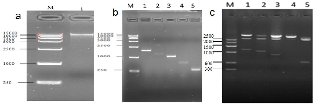Figure 9. Cloned and identified sequence of the cattle UCP3 promoter (a) The electrophoretogram of DNA, the product was run on a 1.5% agarose gel; (b) Different PCR products of UCP3 promoters; (c) Restriction analysis Identification of pUCm-T-ucp3-pro.