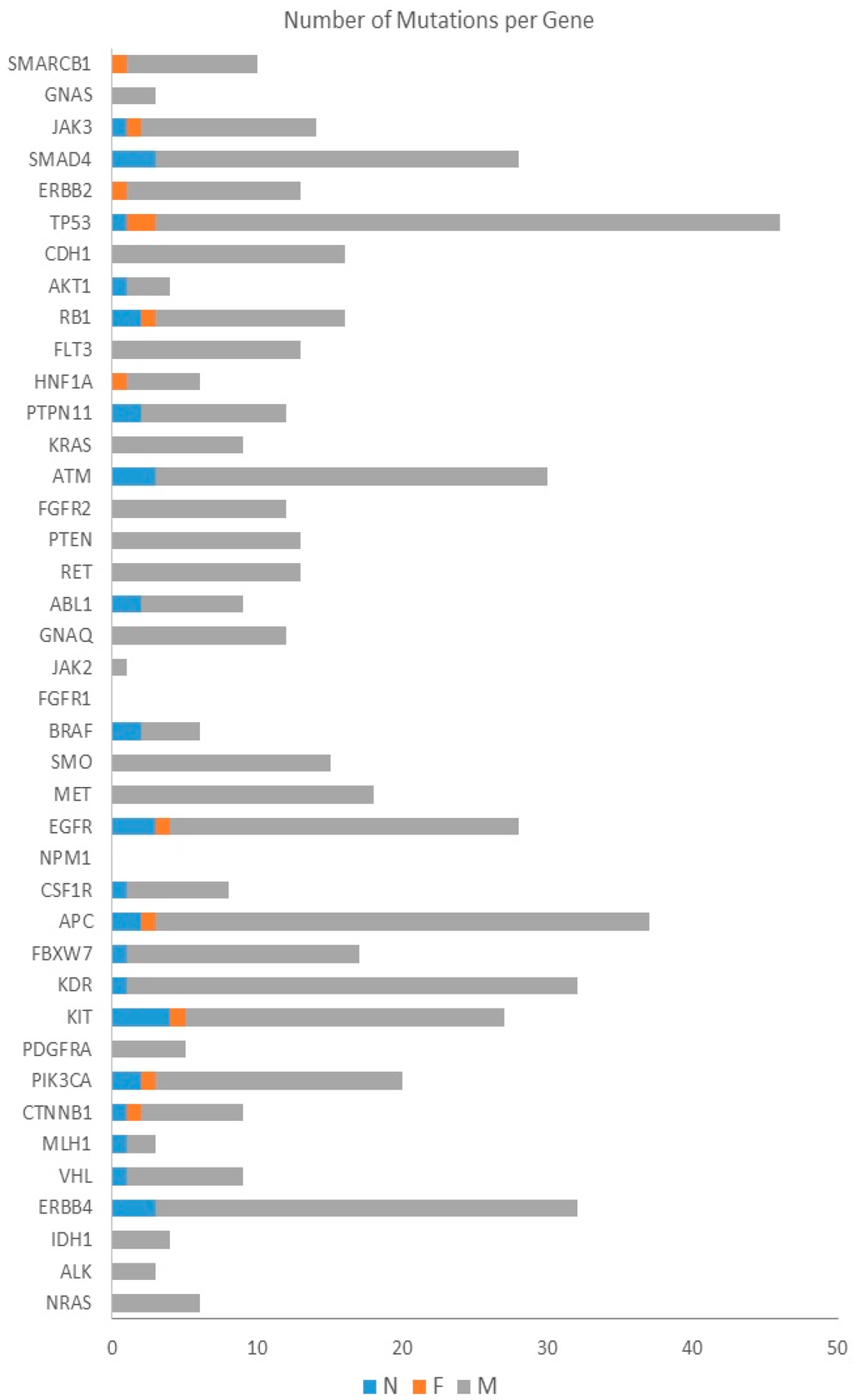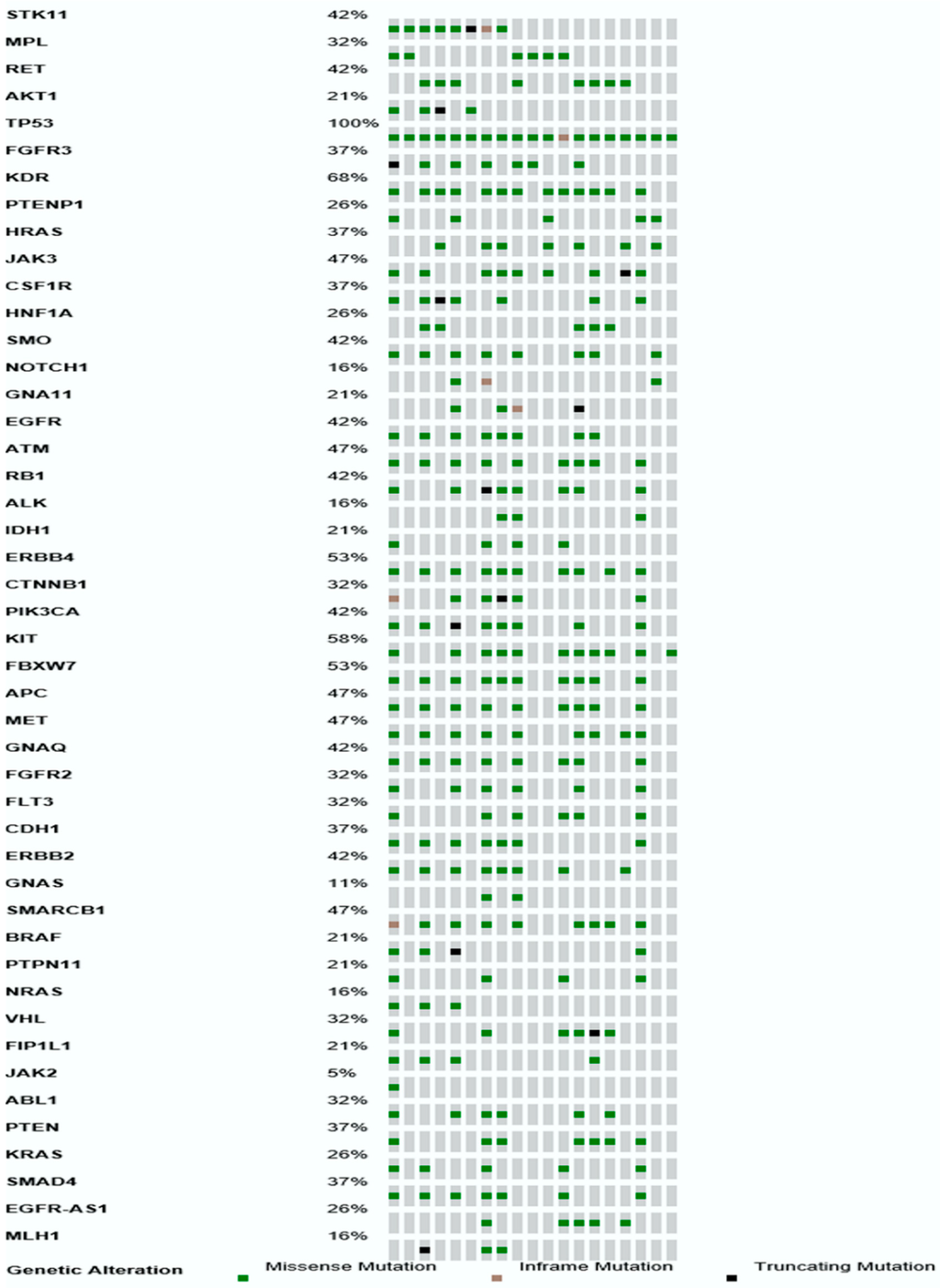 Some of the genes were highly mutated, harboring forty or more mutations (identified in the coding regions of seven targeted genes: ERBB4, KIT, KDR, APC, EGFR, TP53 and SMAD4). On the other hand, targeted sequencing for the chosen panel of genes failed to detect any mutations in NPM1 and FGFR1, while less than five mutations were identified in MLH1, JAK2 and GNAS genes (Figure 2).