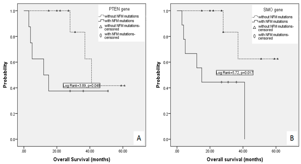 Overall survival according to the presence of NFM mutations in the PTEN gene (A) and the SMO gene (B).