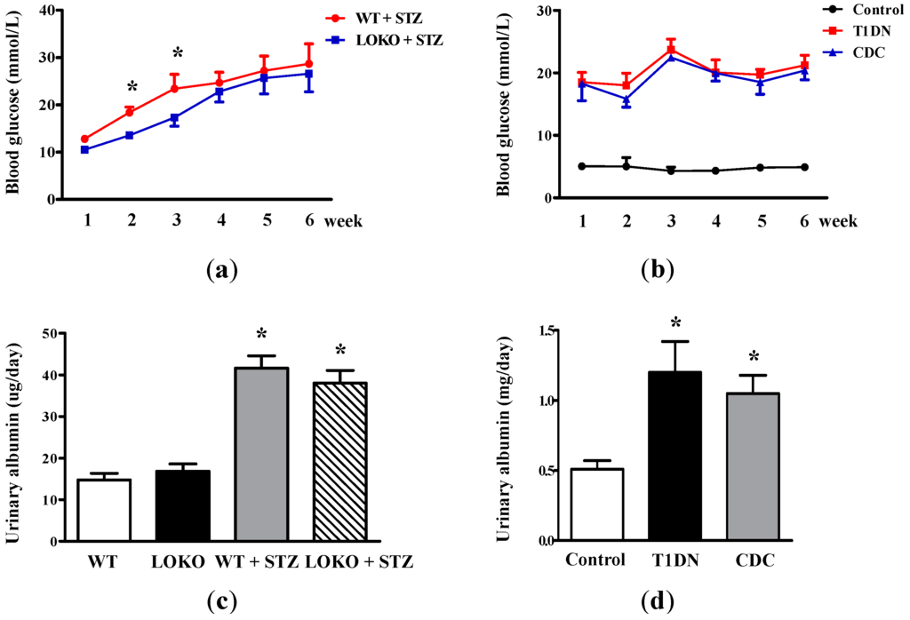 In order to investigate the impact of 12-LO on fasting blood glucose level and MAU, streptozotocin (STZ) was first employed to Sprague-Dawley rats and 12-LO knockout C57BL/6 (12-LOKO) mice, as well as wild-type C57BL/6 (WT) mice to induce type-1 diabetes. Rats or mice that failed to develop hyperglycemia were excluded from this study. As shown in Figure 1a, fasting blood glucose levels in WT + STZ significantly increased compared to LOKO + STZ (p < 0.01) at the second and third week after STZ administration. Although fasting blood glucose of LOKO + STZ was slightly lower compared to WT + STZ during the fourth–sixth week, no significant difference was detected between these two groups; suggesting that the deletion of 12-LO slightly protected STZ-induced hyperglycemia in the early stage of diabetes. 12-LO inhibitor, cinnamyl-3,4-dihydroxy-α-cynanocinnamate (CDC), treatment slightly decreases blood glucose in STZ-induced type-1 diabetic rats compared to non-treated type-1 diabetic rats at the second and third week after STZ administration, but this did not reach statistical significance (Figure 1b). These results suggest that 12-LO inhibition may slightly decrease STZ-induced hyperglycemia for a short time by β-cell protection; nonetheless, this protective effect was gradually overcome by the destructive effect of STZ.