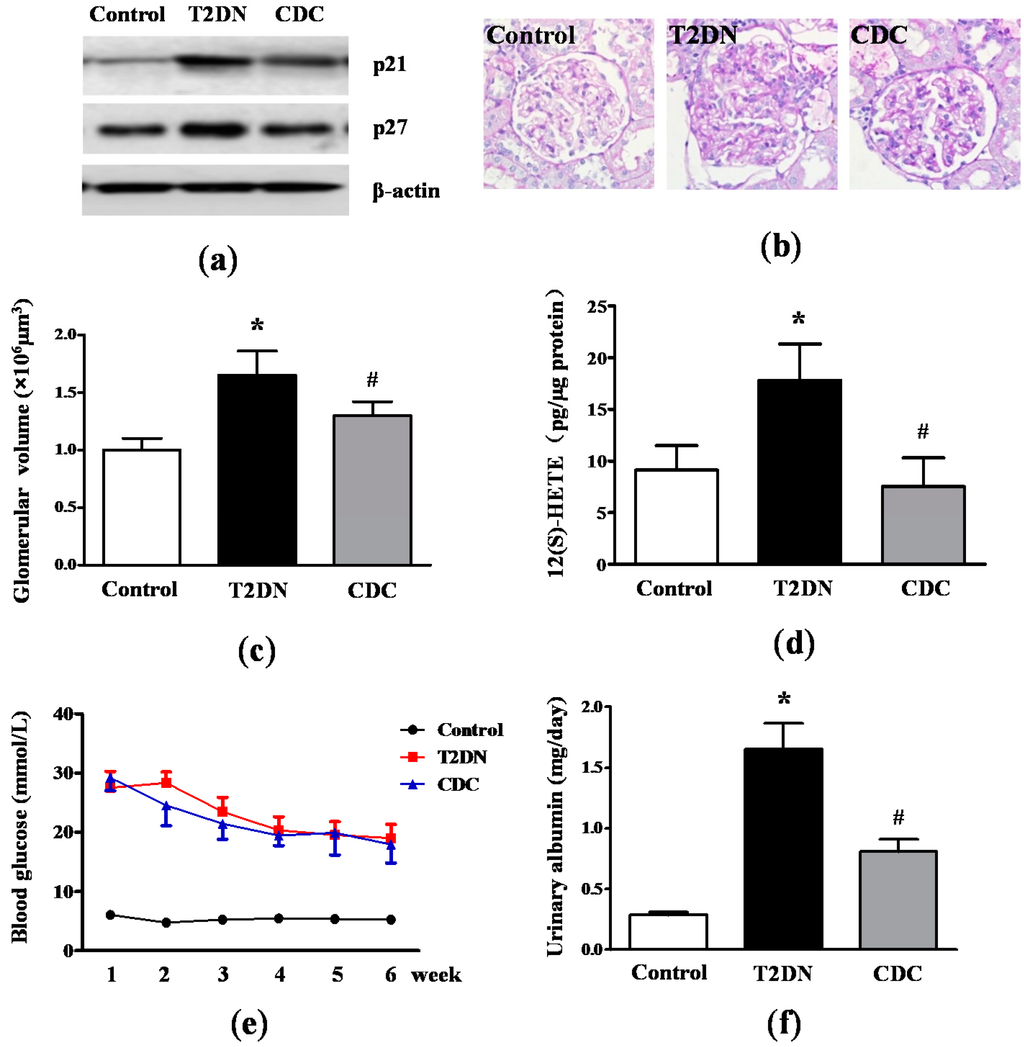 Effect of 12-LO on kidney hypertrophy, fasting blood glucose and MAU in type-2 diabetic rats. (a) Expression levels of p21 and p27 in glomeruli of control, type-2 diabetic rats and CDC-treated rats were determined by Western blot; (b) PAS staining of kidney cortical tissue in control, type-2 diabetic rats and CDC-treated rats; (c) glomerular volume of control, type-2 diabetic rats and CDC-treated rats; (d) glomerular 12(S)-HETE levels of control, type-2 diabetic rats and CDC-treated rats were measured by ELISA; (e) the level of fasting blood glucose in control, type-2 diabetic rats and CDC-treated rats; (f) the level of MAU in control, type-2 diabetic rats and CDC-treated rats; n = 20 in each group. Data are presented as the mean ± SD of three independent experiments; * p < 0.01 vs. the control; # p < 0.05 vs. T2DN.