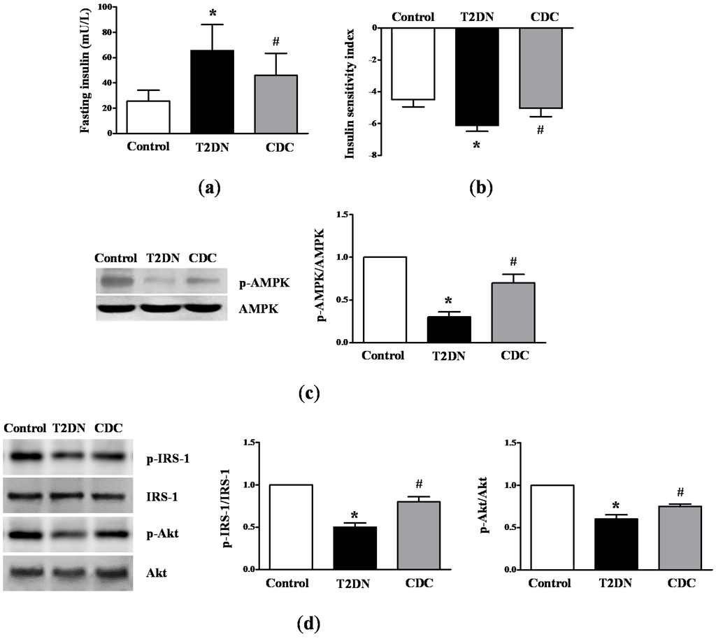 In order to evaluate the effect of 12-LO on IR-related parameters, fasting insulin level, insulin sensitivity index (ISI) and AMP-activated protein kinase (AMPK) activation were measured. As shown in Figure 3a, a significant increase in fasting insulin level was observed in diabetic rats compared to control rats (p < 0.01); and CDC treatment prevented the diabetes-induced increase in fasting insulin level (p < 0.05). Furthermore, it was found that ISI was significantly lower in diabetic rats compared to the control (p < 0.01), and CDC treatment attenuated this abnormality (p < 0.05; Figure 3b). Furthermore, a significant decrease in p-AMPK level in skeletal muscles was observed in diabetic rats, compared to the control (p < 0.01); and CDC treatment partially, but significantly prevented the decrease in p-AMPK levels (p < 0.05; Figure 3c). We also detected the role of 12-LO in the insulin signaling insulin receptor substrate (IRS)-protein kinase B (Akt) pathway. As shown in Figure 3d, we found that p-IRS-1 and p-Akt levels decreased significantly in skeletal muscle of type-2 diabetic rats compared to the control (p < 0.01), and CDC treatment ameliorated the abnormalities (p < 0.05). These results indicate that CDC administration improved IR.