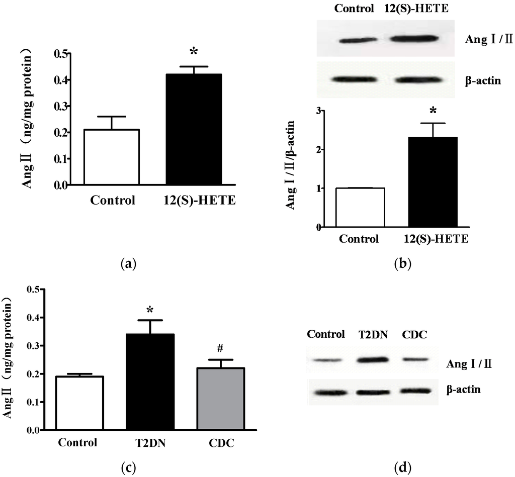 Effect of 12-LO on Ang II levels in rat glomeruli. (a) Ang II content in glomeruli of control and 12(S)-HETE infusion rats was determined by ELISA; n = 10 in each group; (b) Ang I/II expression in glomeruli of control and 12(S)-HETE infusion rats was determined by Western blot; n = 10 in each group; (c) Ang II content in glomeruli of control, type-2 diabetic rats and CDC-treated rats was determined by ELISA; n = 20 in each group; (d) Ang I/II expression in glomeruli of control, type-2 diabetic rats and CDC-treated rats was determined by Western blot; n = 10 in each group. Data are presented as the mean ± SD of three independent experiments; * p < 0.01 vs. corresponding controls; # p < 0.05 vs. T2DN.