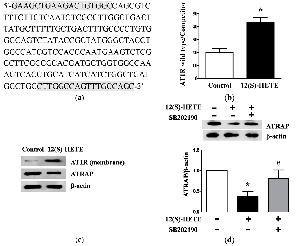 In order to examine the possible signal pathway of 12(S)-HETE, serum-depleted MCs were treated with 12(S)-HETE (10−7 mol/L) with or without p38 mitogen-activated protein kinase (MAPK) inhibitor SB202190 (10−6 mol/L). The 12(S)-HETE stimulation alone significantly decreased ATRAP protein expression compared to the control (p < 0.01). In the presence of SB202190, 12(S)-HETE-induced ATRAP reduction was clearly attenuated (p < 0.05; Figure 5d), indicating that the p38 MAPK pathway was involved in mediating the 12-LO induced decrease in ATRAP.