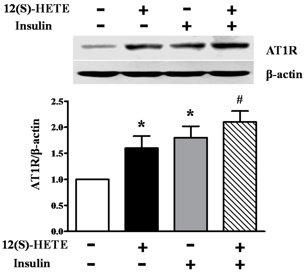 In order to investigate the role of 12-LO activation and insulin on AT1R expression, MCs were treated with 12(S)-HETE (10−7 mol/L) and/or insulin (10−6 mol/L) for 24 h. As shown in Figure 6, although both 12(S)-HETE and insulin significantly increased AT1R protein levels in rat MCs (p < 0.01), the combination of 12(S)-HETE and insulin demonstrated a synergetic effect on AT1R upregulation, compared to each sole stimulation alone (p < 0.05; Figure 6).