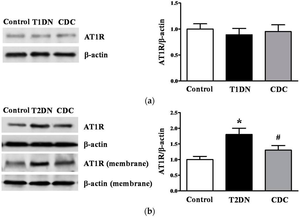 The expressions of AT1R was upregulated in type-2 diabetic glomeruli [20], but was downregulated in type-1 diabetic glomeruli [29]. Consistent with previous studies, we found that AT1R expression increased in type-2 diabetic glomeruli, but this did not change in type-1 diabetic glomeruli. Moreover, CDC treatment only decreased the expression of AT1R and MAU in type-2 diabetic rats, but not in type-1 diabetic rats.