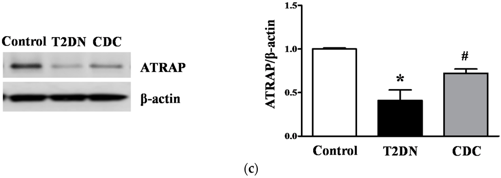 A slightly decreased AT1R expression was observed in glomeruli in type-1 diabetic rats compared to the control, but this decrease did not reach statistical significance; and 12-LO inhibition did not alter AT1R protein expression (Figure 7a). As shown in Figure 7b, total AT1R protein and membrane AT1R protein expression in glomeruli in type-2 diabetic rats significantly increased compared to the control (p < 0.01); and CDC treatment ameliorated AT1R elevation induced by type-2 diabetes (p < 0.05). As expected, ATRAP decreased in type-2 diabetic rat glomeruli compared to the control (p < 0.01; Figure 7c); but this abnormality was attenuated by CDC treatment (p < 0.05, Figure 7c).