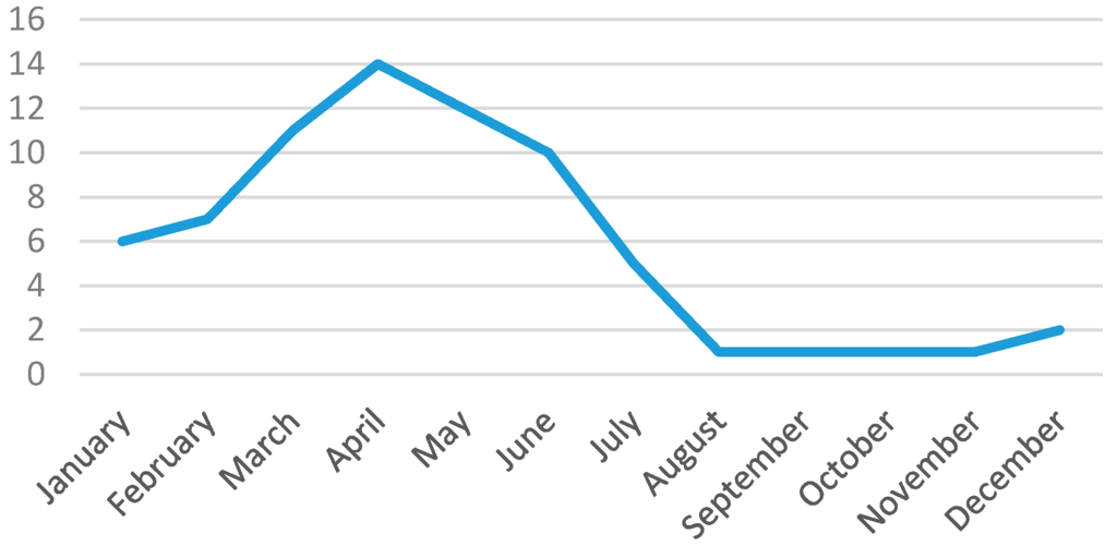 Out of 431 patients, 71 presented with VSCs (16.4%; 95% CI: 13.0%–20.0%). VSCs had a seasonal distribution with a peak of incidence in spring, as reported in Figure 1.