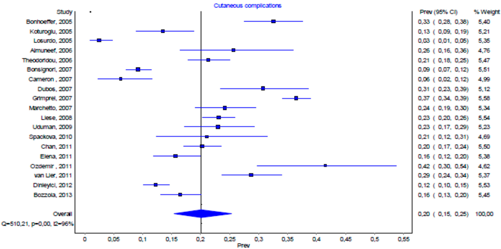 Prevalence of varicella skin complications (VSCs) in hospitalized patients (the % weight of the studies is calculated on the inverse of the variance by using the DerSimonian and Laird method).