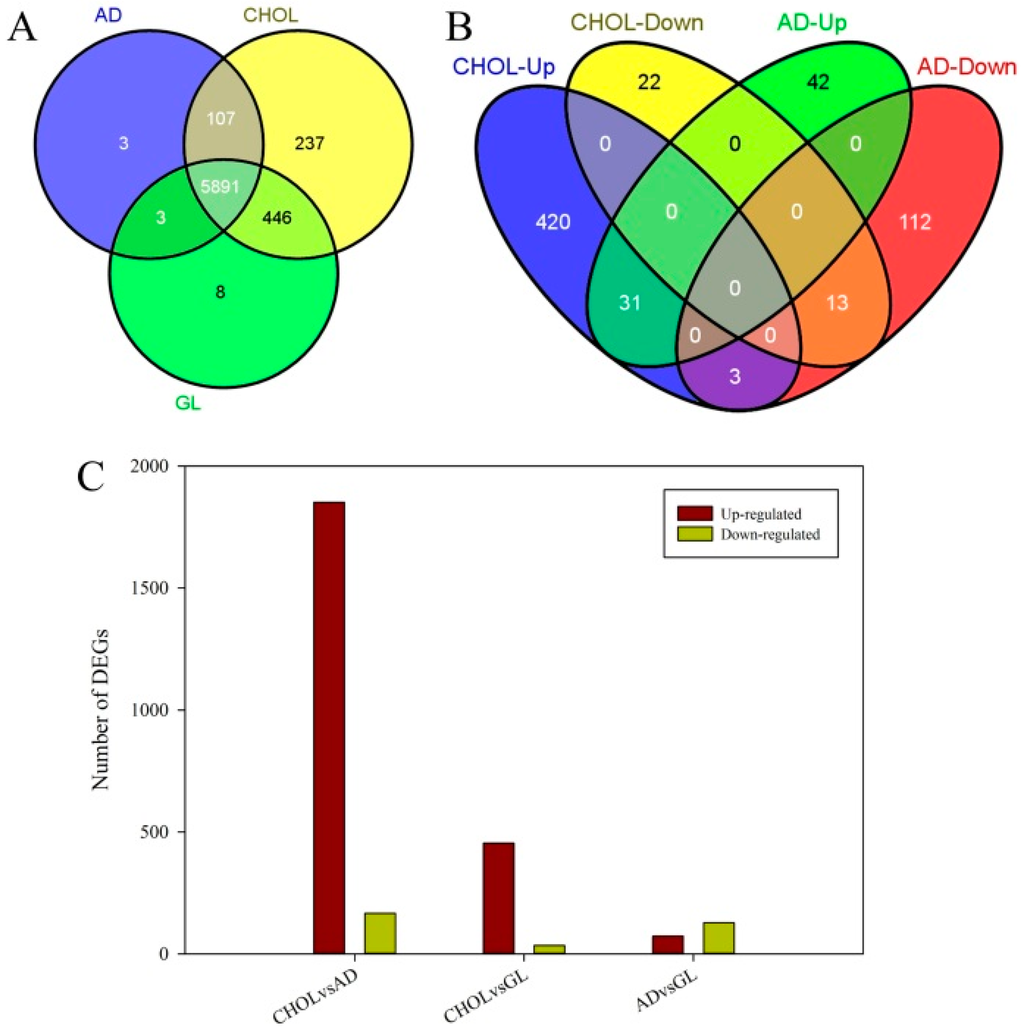 To identify the enriched GO terms, a hypergeometric test was performed and the p-value was adjusted using the Bonferroni method [35]. DEGs identified between AD and CHOL were enriched in the GO term “regulation of response to stimulus”, whereas those identified between CHOL and GL were enriched in “tetrapyrrole binding and oxidoreductase activity”.