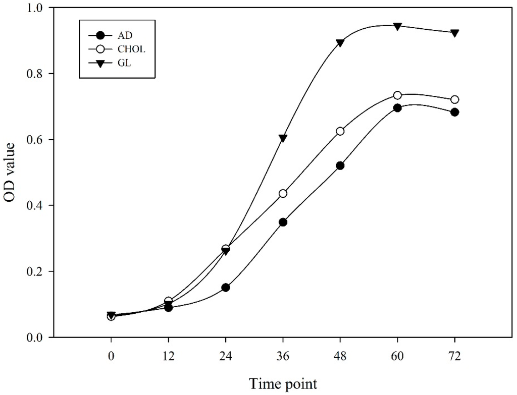 To detect whether the supplemented carbon source changed basic nitrogen and carbon metabolism, key genes involved in nitrogen and carbon metabolism were carefully analyzed. The assimilation and metabolism of inorganic nitrogen is a complex process involving a series of enzymes, including nitrate reductase (NR, EC:1.7.99.4), nitrite reductase (NiR, EC:1.7.1.4), glutamine synthetase (GS, EC:6.3.1.2), glutamate synthase (GOGAT, EC:1.4.1.13/1.4.1.14/1.4.7.1), glutamate dehydrogenase (GDH, EC:1.4.1.2/1.4.1.3/1.4.1.4), carbamoyl phosphate synthase (CPS, EC:6.3.4.16) et al. [36,37]. In this study, M. smegmatis strain MC2 155 was grown in chemically defined medium with ammonia-nitrogen as the sole nitrogen source, therefore, the assimilation of ammonia-nitrogen is necessary for maintaining basic metabolism. Three ammonium transporter (AMT) encoding genes were analyzed carefully (Table 2). MSMEG_4635 was the most highly expressed AMT, and its expression abundance under different culture conditions was not obviously different between the samples (22.86, 28.85 and 28.80). The absorbed ammonium can be then converted into nitrite by ammonia monooxygenase (EC:1.14.99.39) and hydroxylamine dehydrogenase (EC:1.7.2.6), and then converted into nitrate by NR. However, we could not identify ammonia monooxygenase and hydroxylamine dehydrogenase encoding genes in our RNA-Seq data. Five NR encoding genes were detected and were all highly expressed (Table 2 and Table S1). Among these genes, MSMEG_2837 was most highly expressed in AD, followed by GL and CHOL, while MSMEG_5140 and MSMEG_5139 were most highly expressed in CHOL. The absorbed ammonium can be also catalyzed by CPS, GS and GOGAT to produce carbamoyl phosphate and l-Glutamine. Three CPS encoding genes were all highly expressed in CHOL. Meanwhile, the most highly expressed GS (MSMEG_4294) had expression levels of 3744.30, 990.23 and 1818.46 under the three conditions, whereas the other two highly expressed GS genes (MSMEG_3561 and MSMEG_4290) were both most highly expressed in GL. In contrast to the expression pattern of MSMEG_4294, the two most highly expressed GOGATs, MSMEG_3225 and MSMEG_3226, were both up-regulated by GL, while the other four were all more highly expressed in CHOL. GDH catalyzes the reversible reaction between ammonium and l-Glutamine. However, no obvious difference was observed under different conditions for the most highly expressed GDH encoding gene (MSMEG_4699). Furthermore, key enzymes encoding genes involved in glycolysis and the citrate cycle were carefully analyzed, including the hexokinase (HXK, EC:2.7.1.1), 6-phosphofructokinase (PFK, EC:2.7.1.11), pyruvate kinase (PK, EC:2.7.1.40), citrate synthase (CS, EC:2.3.3.1), isocitrate dehydrogenase (IDH, EC:1.1.1.41), alpha-ketoglutarate decarboxylase (KGD, EC:1.2.4.2) and dihydrolipoamide dehydrogenase (DLD, EC:1.8.1.4). Results demonstrated that there were no apparent tendency was observed among three different conditions (Table S1). These results indicated that although different supplements resulted in some changes in gene expression, primary metabolism was not obviously affected. To verify these results, we measured the optical density (OD) value at different time points for three cultivation conditions. It was found that M. smegmatis MC2 155 showed an S-shaped growth curve in the three different supplemented media (Figure 2).