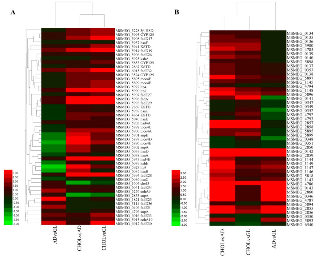 In the classic cholesterol catabolism pathway, degradation is initiated by 3-beta hydroxysteroid dehydrogenase/isomerase (3β-HSD) and cholest-4-en-3-one 26-monooxygenase (CYP125, EC:1.14.13.141). In this study, one 3β-HSD encoding gene was found to be expressed (MSMEG_5228). When M. smegmatis was grown in cholesterol supplemented media, 3β-HSD was significantly up-regulated, and its expression level was 6.86, 26.34 and 5.96 in AD, CHOL and GL, respectively (Table S6). Three CYP125 encoding genes were detected and all had the highest expression levels in CHOL (MSMEG_3524, MSMEG_5853 and MSMEG_5995) (Figure 3, Table S6). The 3-ketosteroid-δ-1-dehydrogenase (KSTD, EC:1.3.99.4) can catalyze the conversion of androstenedione into androsta-1,4-diene-3,17-dione. When growth media were supplemented with androstenedione or cholesterol M. smegmatis strain MC2 155 increased the expression of several KSTD genes (MSMEG_2867, MSMEG_2869, MSMEG_4864 and MSMEG_5941) (Figure 3, Table S6). For example, the expression level of MSMEG_5941 was 20.86 in GL, but in androstenedione and cholesterol supplemented media, it was 41.15 and 115.42, respectively. MSMEG_2867 is another KSTD encoding gene that had an expression level of 25.14, 35.54 and 17.88 in AD, CHOL and GL, respectively. 3-Ketosteroid 9-α-hydroxylase (KshAB, EC:1.14.13.142), 3-hydroxy-9,10-secoandrosta-1,3,5(10)-triene-9,17-dione monooxygenase (HsaAB, EC:1.14.14.12), 3,4-dihydroxy-9,10-secoandrosta-1,3,5(10)-triene-9,17-dione 4,5-dioxygenase (HsaC, EC:1.13.11.25) and 4,5:9,10-diseco-3-hydroxy-5,9,17-trioxoandrosta-1(10), 2-diene-4-oate hydrolase (HsaD, EC:3.7.1.17) are the downstream enzymes involved in steroid degradation. However, all of these enzyme encoding genes were not detected based on the annotation information in the genome.