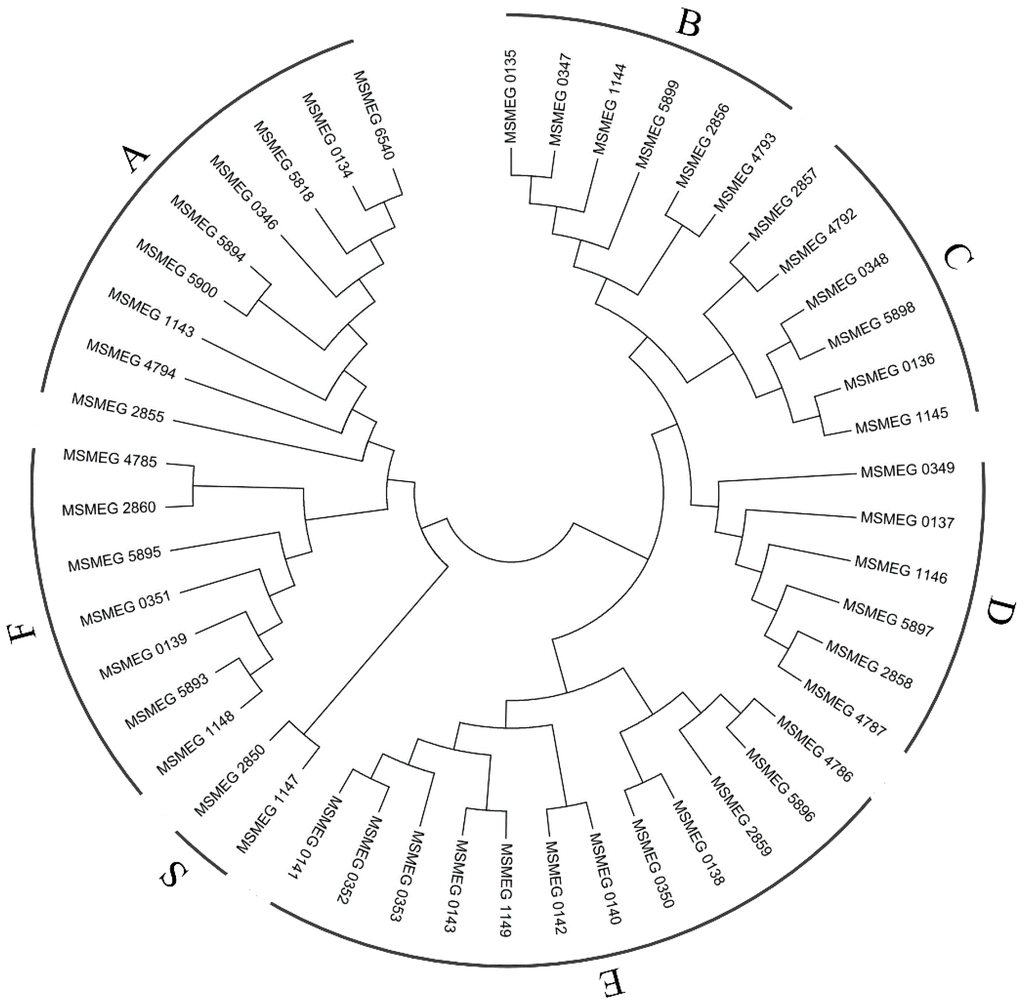 Mammalian cell entry (MCE) is a protein family that is crucial for virulence of certain members of the genus Mycobacterium, which enables mycobacteria to derive carbon and energy from the cholesterol of host cell membranes and to enter mammalian cells [42]. In this study, 48 MCE related genes were detected. Combining the genome annotation results with the BLASTP similarity search results, a total of 11 MCE1, one MCE2, six MCE3, six MCE4 and six MCE5 genes were identified. To further analyze these MCE related genes, a phylogenetic tree was constructed using the Neighbor-Joining method in the MEGA6 program [43] (Figure 4). It was shown that the 48 MCE related genes can be clustered into seven groups, including group A–F, as well as an additional group (Figure 4, Table S7). The A group consisted of nine MCE A genes, B, C and D group had six MCE B, MCE C and MCE D separately, E and F group consisted of 12 and seven genes. The additional group (S) consisted of MSMEG_2850 and MSMEG_1147, which were annotated as MCE5E and MCE related family protein, respectively (Figure 4, Table S7).