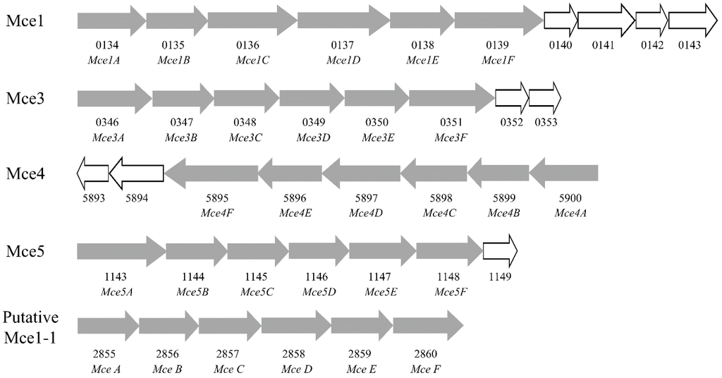 The organization of the MCE operons in M. smegmatis MC2 155 genome. The operon structures of the five MCE operons are shown. The grey arrows represent MCE genes, while the white arrows represent other MCE related genes.