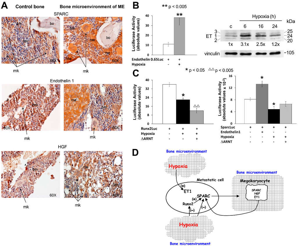 Production of biological stimuli by megakaryocytes in bone metastases, and their reciprocal regulation. (A) Immunohistochemistry of biological stimuli; (B) Effects of hypoxia on ET-1 transactivation and protein levels of the three isoforms of ET; (C) Runx2 and SPARC activities under hypoxia; (D) Cross-talk of metastasis and microenvironment through biological stimuli and involvement of hypoxic conditions.