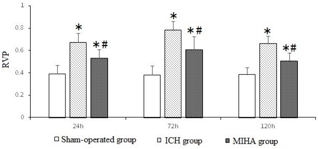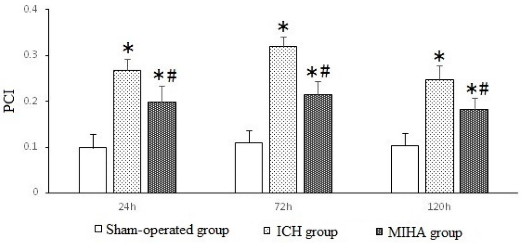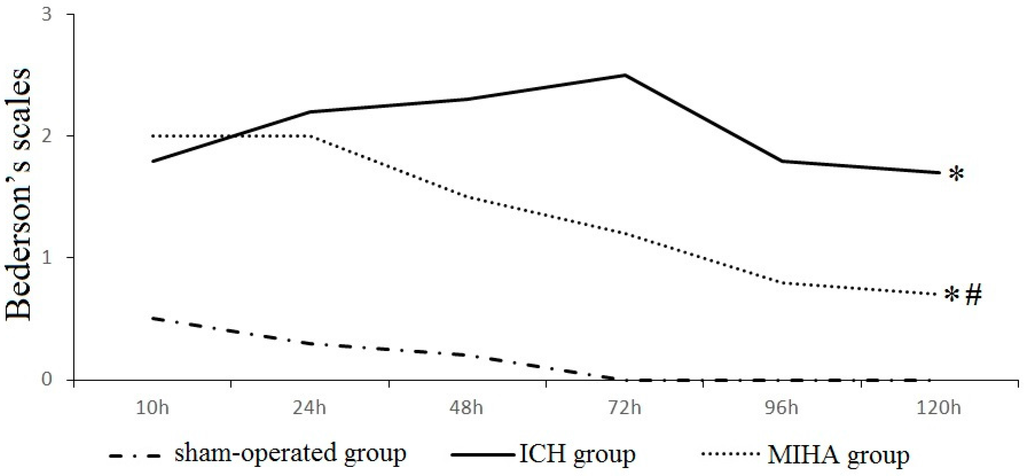 There were no obvious neuromotor dysfunction on rats in the sham-operated group, while different degrees of neurological deficits were seen in ICH group and MIHA group at each time point. When tested at 6 and 24 h after ICH, Bederson’s scales in ICH group and MIHA group were obviously higher than those in the sham-operated group (p < 0.05), while there was no significant difference between ICH group and MIHA group (p > 0.05). When tested at 48, 72, 96, and 120 h, the Bederson’s scales in ICH group were the highest, followed by MIHA group’s, while those were the lowest in sham-operated group, difference among them was significant (p < 0.05) (Table 1 and Figure 1). The results show that after treated by MIHA the Bederson’s scales of rats decrease markedly at the time points 48, 72, 96, and 120 h after ICH, compared with ICH group, which means MIHA can significantly improve the neurological deficits. A subtle and opposite result is determined 6 h after ICH, but it turns out to be statistically insignificant. This may be related to the premature detection, as any kind of treatment should take a certain period of time to come into effect.