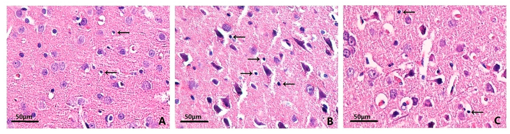 The morphological and structural changes of neurons in different groups, by HE staining, magnification 400×, scale bar = 50 µm. (A) Sham-operated group; (B) ICH group; (C) MIHA group; (arrows) denatured cells.