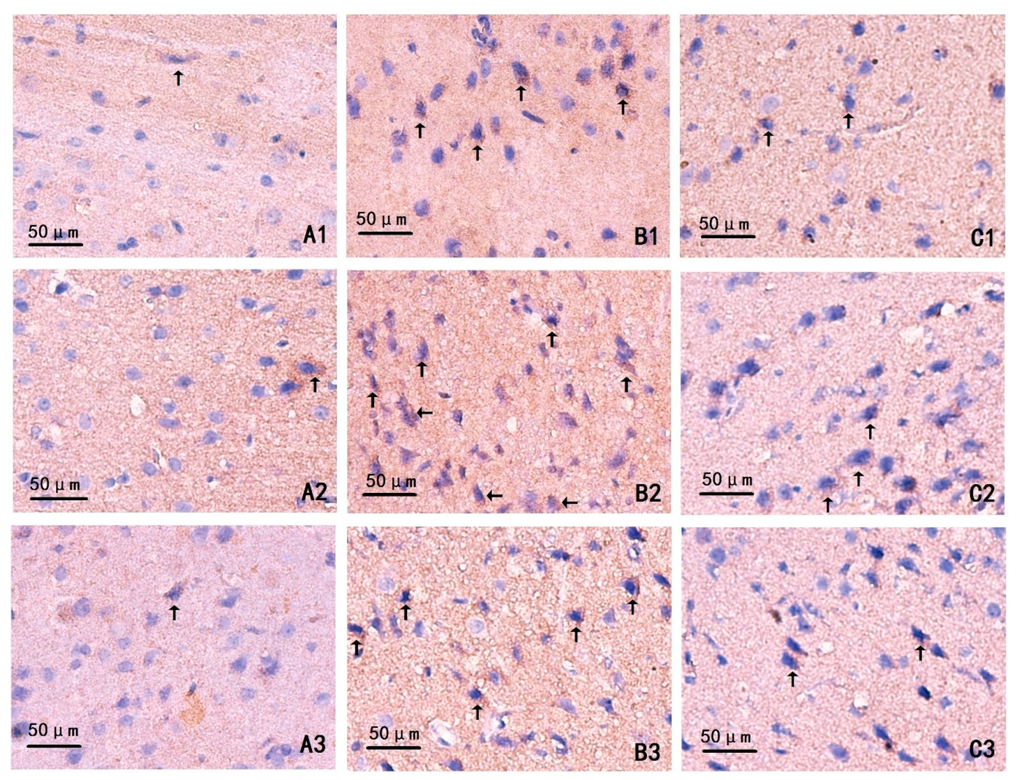 The expression of phospho-c-Jun NH2-terminal kinase (pJNK) in cortex of rats shown by immunohistochemical assay, magnification 400×, scale bar = 50 µm. (A1–A3) Sham-operated groups (24 h subgroup, 72 h subgroup, and 120 h subgroup); (B1–B3) ICH groups (24 h subgroup, 72 h subgroup, 120 h subgroup); and (C1–C3) MIHA groups (24 h subgroup, 72 h subgroup, 120 h subgroup); (arrows) positive cells.