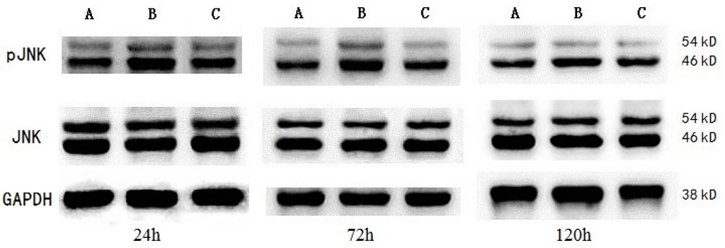 The results of protein expression were quantified by the relative value of the protein (RVP), which was calculated as “the gray value of target protein bands/the gray value of internal control bands”. When tested at 24, 72, and 120 h after ICH, the pJNK expression of ICH group was the highest, followed by MIHA group’s, while that of sham-operated group was the lowest, difference among them was significant (p < 0.05) (Table 5 and Figure 5 and Figure 6), which means the expression of pJNK was obviously decreased after MIHA. However, the expression of total JNK did not change, as there were no significant differences among the three groups for the RVP of total JNK at the three time points (p > 0.05). These results suggest that MIHA can significantly inhibit the JNK signal transduction pathway by reducing the expression of pJNK rather than that of total JNK.