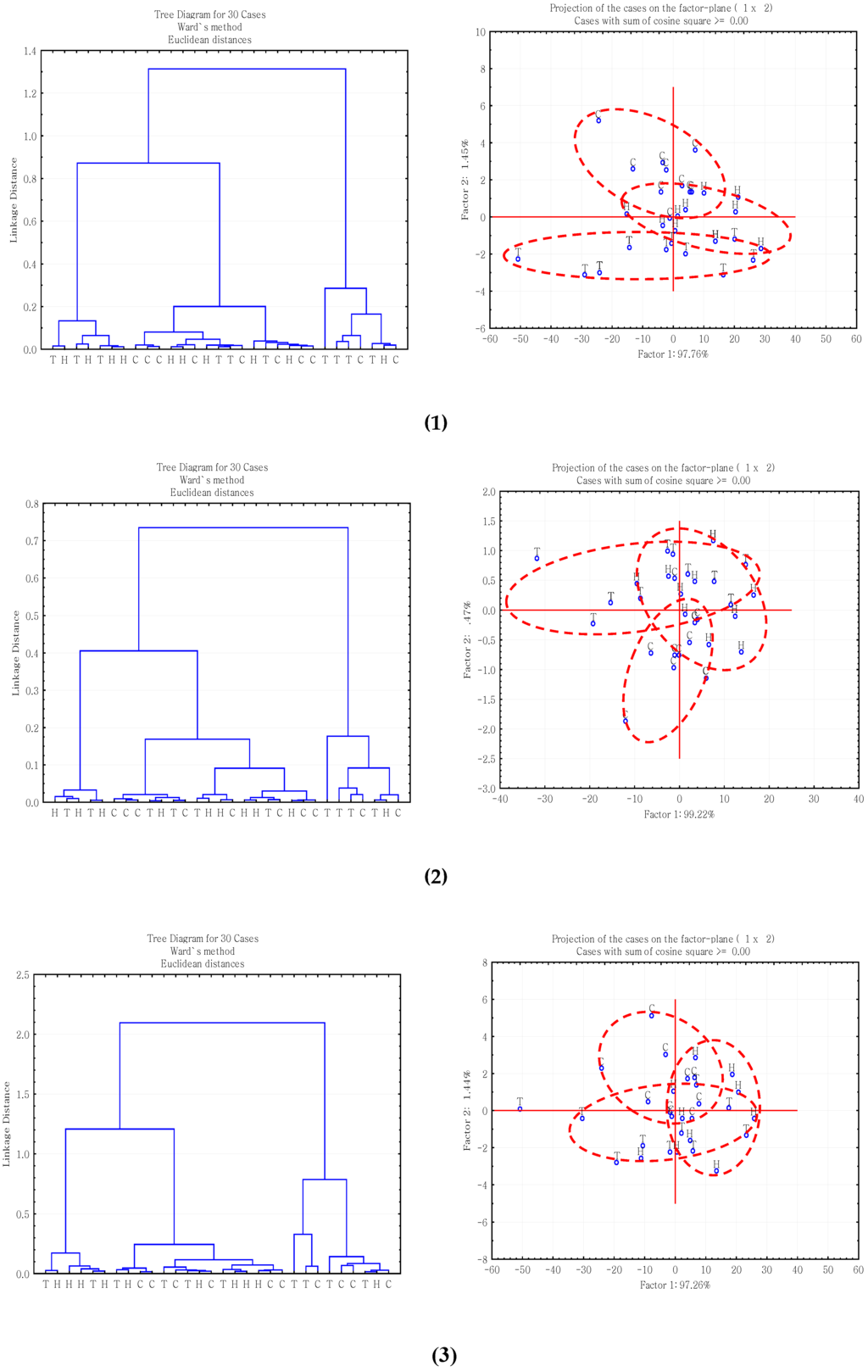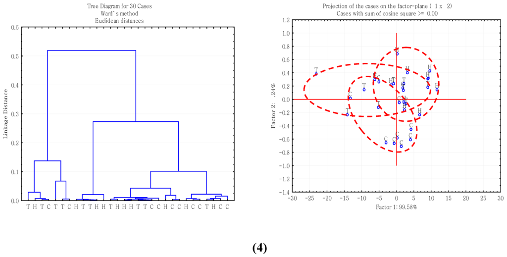 The first multivariate analysis is agglomerative hierarchical cluster analysis (CLA) based on Ward’s algorithm method, which has been successfully used for discriminating functional groups existing in inherent molecular structure of feeds [13,14]. The second multivariate analysis method is principal component analysis (PCA), which is widely used for investigating major sources of variation in feed spectra [15,16]. Figure 1 displayed PCA and CLA analysis results of carbohydrate related fingerprint regions: (1) structural carbohydrate fingerprint region: ca. 1485–1188 cm−1; (2) cellulosic compound fingerprint region: ca. 1294–1188 cm−1; (3) total carbohydrate fingerprint region: ca. 1190–930 cm−1; and (4) non-structural carbohydrate fingerprint region: ca. 931–875 cm−1.