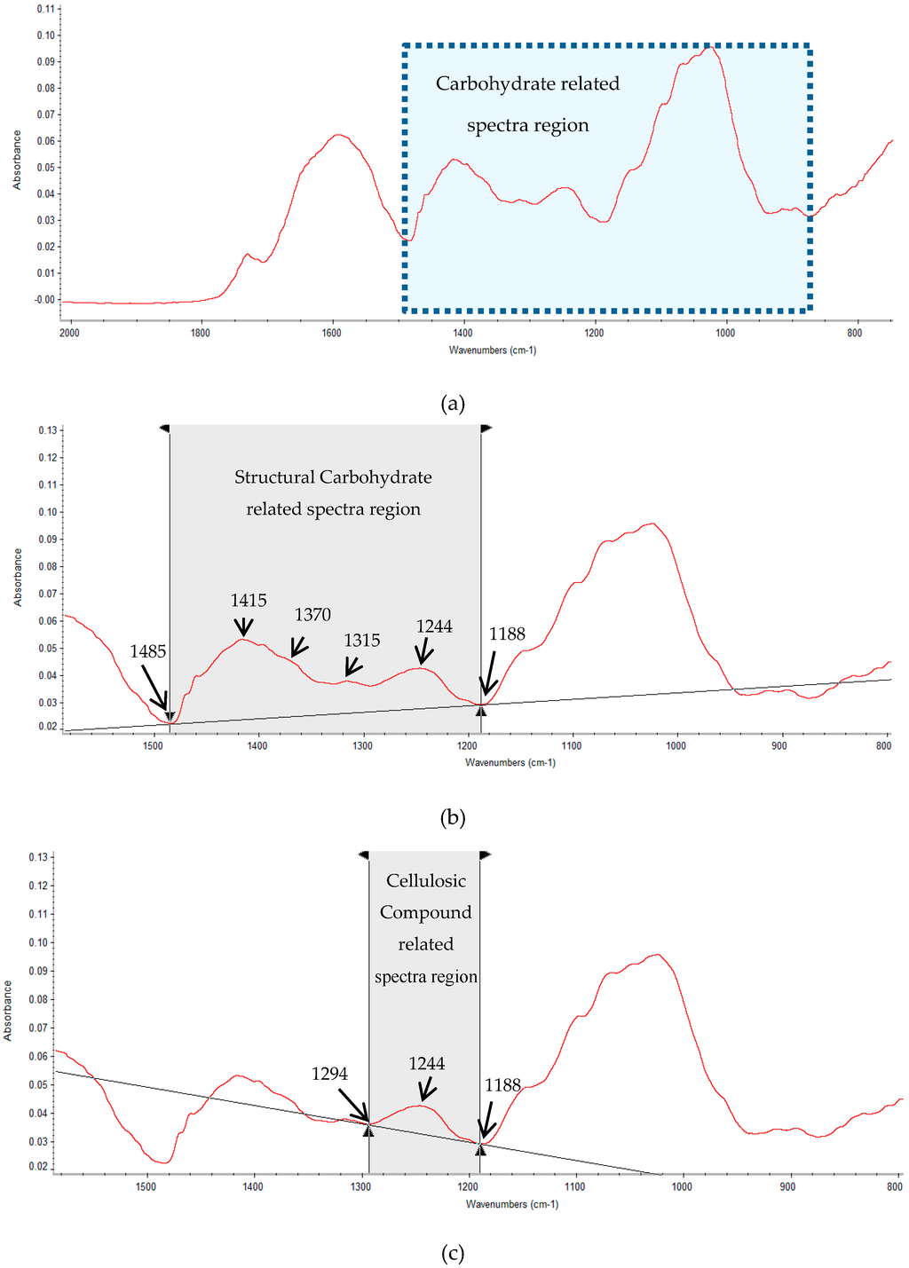 The collected spectra were processed using OMNIC 7.3 software (Spectra Tech, Madison, WI, USA). In accordance with other published studies [16,17,22,23], the well-known molecular spectral parameters for carbohydrate-related functional groups in this study were included: (1) a broad structural CHO peak area (A_StCHO, region and baseline: ca. 1485–1188 cm−1) featuring three major peaks at ca. 1415, 1370, and 1315 cm−1; (2) a cellulosic compound peak area (A_CELC, region and baseline: ca. 1294–1188 cm−1) centered at ca. 1244 cm−1; (3) a total CHO peak area (A_CHO, region and baseline: ca. 1190–930 cm−1) featuring three major peaks at ca. 1150, 1100, and 1025 cm−1; and (4) a non-structural CHO peak area (A_Non-stCHO, region and baseline: ca. 931–875 cm−1) with two peaks at ca. 918 and 895 cm−1 (Figure 2). The ratio of each particular peak intensity was based on individual peak area values.