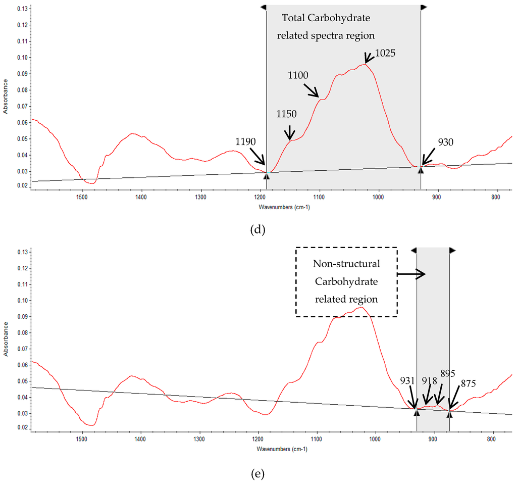 Typical ATR/FTIR molecular spectral for alfalfa: (a) whole mid-IR spectrum region (ca. 4000–800 cm−1); (b) structural carbohydrate related spectrum region (ca. 1485–1188 cm−1); (c) cellulosic compound related spectrum region (ca. 1294–1188 cm−1); (d) total carbohydrate related spectrum region (ca. 1190–930 cm−1); (e) non-structural carbohydrate related spectrum region (ca. 931–875 cm−1).