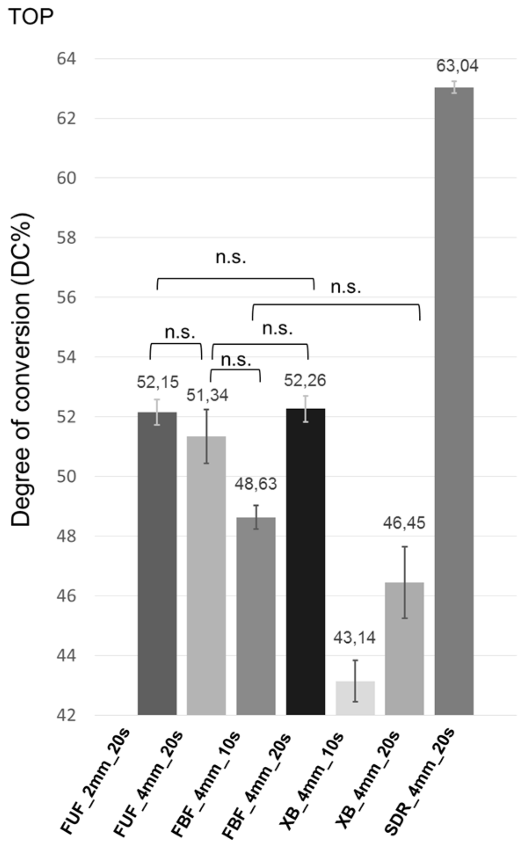 The mean DC values on the top surface of the materials were in the following order: SDR_4mm_20s > FBF_4mm_20s > FUF_4mm_2mm > FUF_4mm_20s > FBF_4mm_10s > XB_4mm_20s > XB_4mm_10s; however, the order of the mean DC values on the bottom surface was significantly different from the top surface: SDR_4mm_20s > FUF_2mm_20s > XB_4mm_20s > FBF_4mm_20s > XB_4mm_10s > FBF_4mm_10s > FUF_4mm_20s. Dunnett’s t-test showed that all of the investigated materials had statistically significant differences in DC% at the bottom surface when compared to each other, except between FBF_4mm_20s and XB_4mm_20s (p = 0.221). On the contrary, between FUF_2mm_20s and FUF_4mm_20s (p = 0.306), FUF_2mm_20s and FBF_4mm_20s (p = 1.000), FUF_4mm_20s and FBF_4mm_20s (p = 0.241), FUF_4mm_20s and FBF_4mm_10s (p = 0.059) and between XB_4mm_20s and FBF_4mm_10s (p = 0.063), Dunnett’s t-test did not show significant difference in DC% at the top surface. The conventional flowable composite FUF_4mm_20s had the lowest DC value at the bottom (16.53%), while SDR_4mm_20s (50.05%) had the highest DC value not only at the bottom, but at the top surface, as well. The extended curing time of FBF and XB from 10–20 s significantly increased the DC%, especially at the bottom surface.