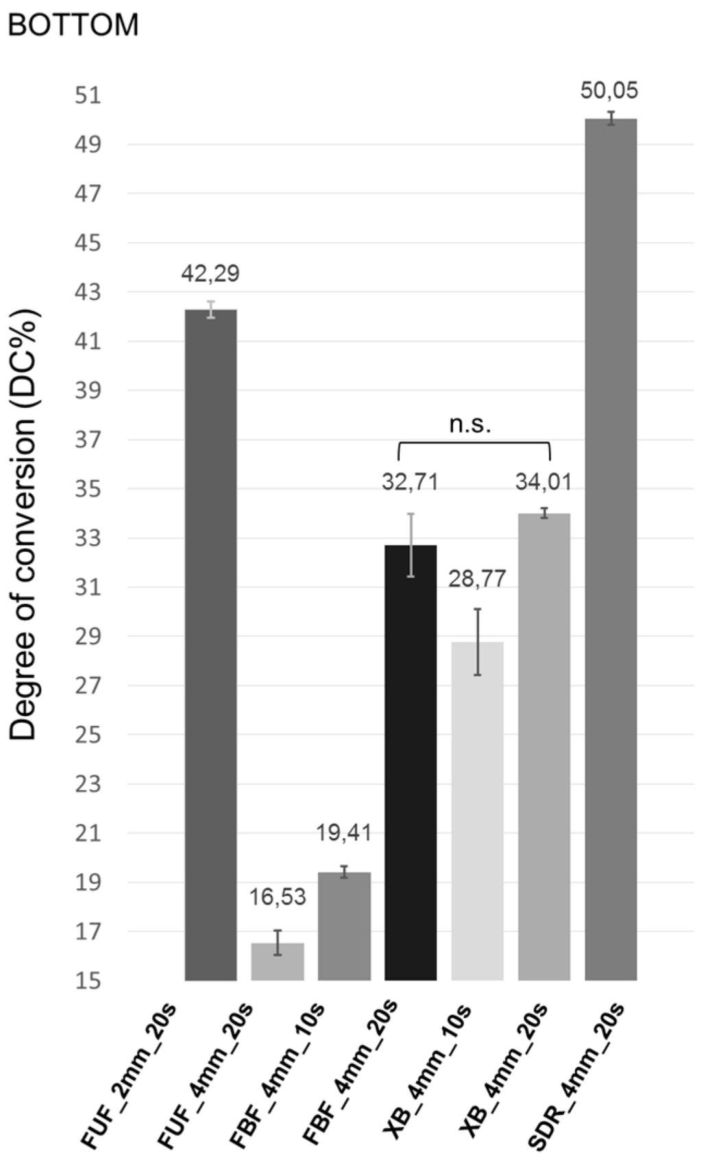 Mean DC% and 95% confidence intervals of the bottom surface of the samples (abbreviations: DC, degree of conversion; n.s., not significant difference; FUF_2mm_20s, Filtek Ultimate Flow in a 2-mm layer thickness cured for 20 s; FUF_4mm_20s, Filtek Ultimate Flow in a 4-mm layer thickness cured for 20 s; FBF_4mm_10s, 4 mm-thick Filtek Bulk Fill light cured for 10 s; FBF_4mm_20s, 4 mm-thick Filtek Bulk Fill light cured for 20 s; XB_4mm_10s, 4 mm-thick X-tra Base light cured for 10 s; XB_4mm_20s, 4 mm-thick X-tra Base light cured for 20 s; SDR_4mm_20s, SureFil SDR Flow in a 4-mm layer thickness cured for 20 s).