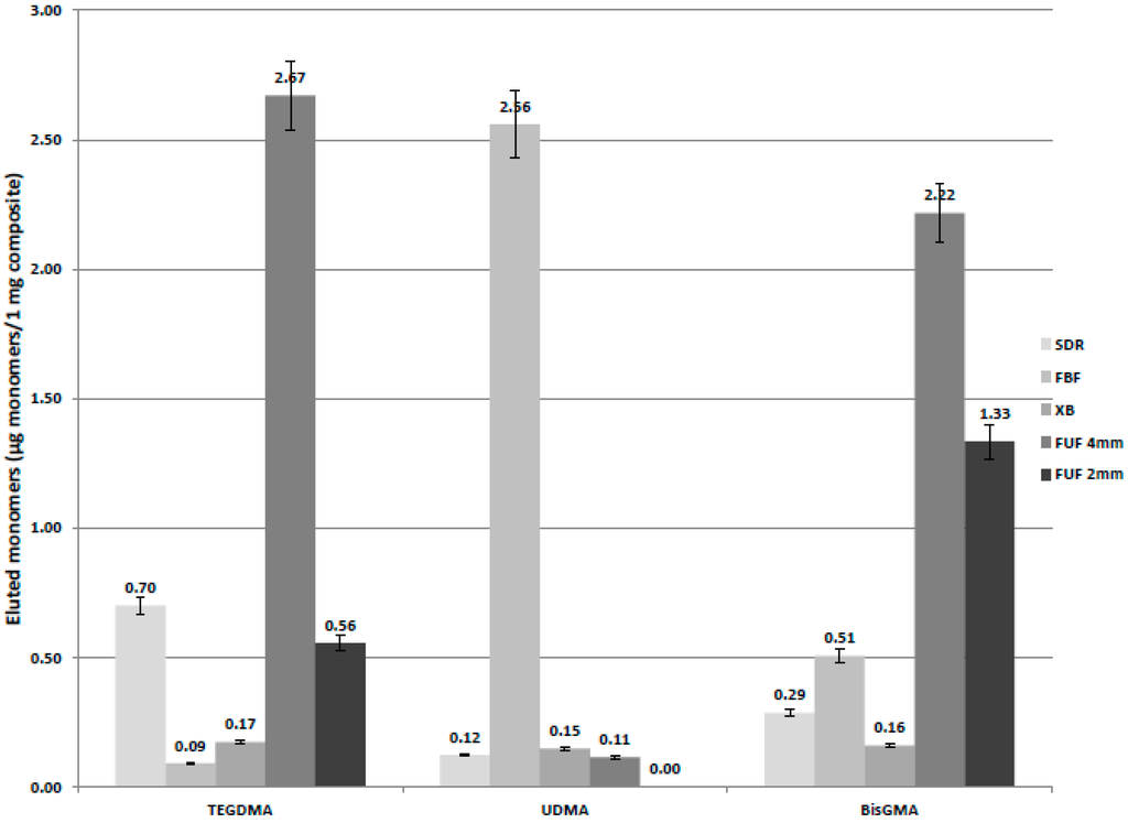 Amount of eluted monomers from bulk-fill and conventional flowable composites. (Abbreviations: SDR, SureFil SDR Flow in a 4-mm layer thickness light cured for 20 s; FBF, Filtek Bulk Fill in a 4-mm layer thickness light cured for 10 s; XB, X-tra Base in a 4-mm layer thickness light cured for 10 s; FUF 4 mm, Filtek Ultimate Flow in a 4-mm layer thickness light cured for 20 s; FUF 2 mm, Filtek Ultimate Flow in a 2-mm layer thickness light cured for 20 s).