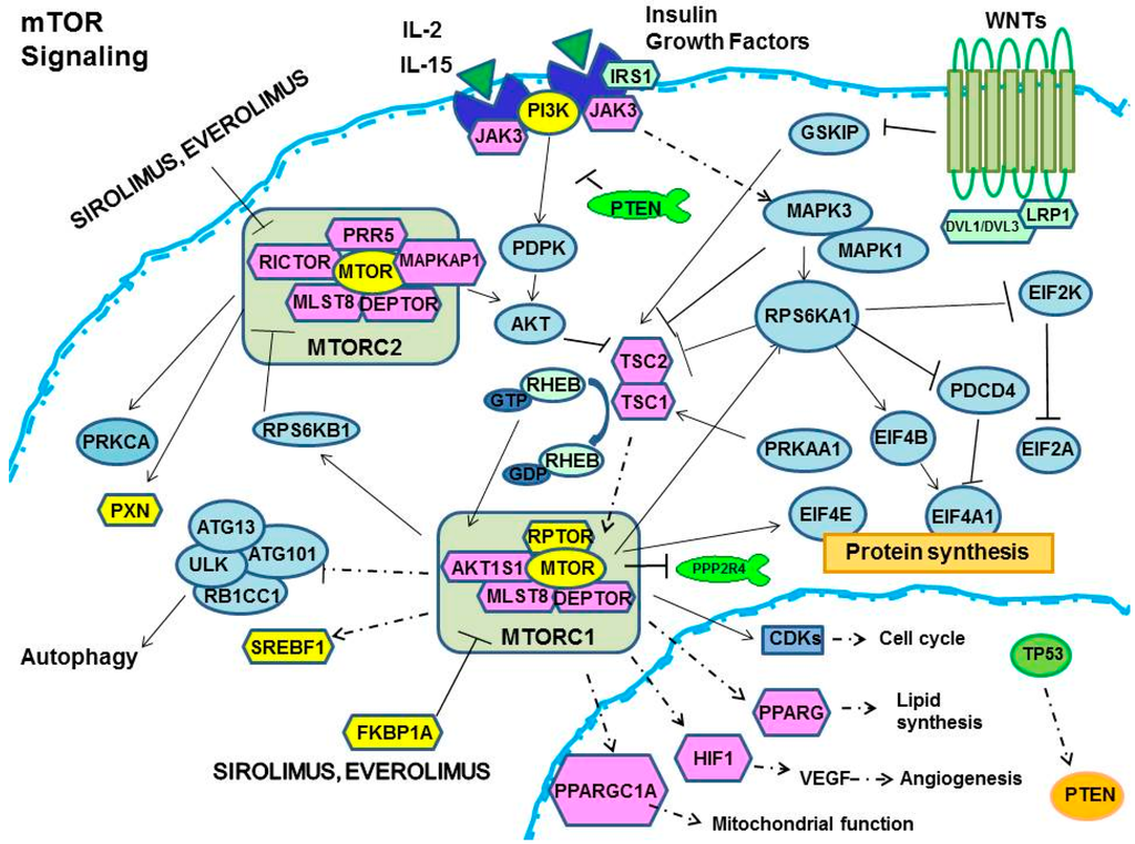 The FKBP12-EVR or FKBP12-SRL complex allosterically inhibits mTORC1 activity and signaling by weakening the interaction between mTORC1 and RAPTOR [30,55]. This interaction inhibits downstream functions and pathways including: 1. protein synthesis; 2. HIF-1 and VEGF (VEGFA)-dependent regulation of angiogenesis; 3. lipid biosynthesis; 4. mitochondrial biogenesis and function; 5. cell cycle and growth; and 6. autophagy. All of these effects are modulated/regulated by a large genetic encoding network (Figure 1) (Table 1) [56,57,58,59,60,61,62,63,64,65,66,67,68,69,70,71,72,73,74,75,76,77,78,79,80,81,82,83,84,85,86,87,88,89,90,91,92,93,94,95,96,97,98,99,100,101,102,103,104,105,106,107,108,109,110,111,112,113,114,115].