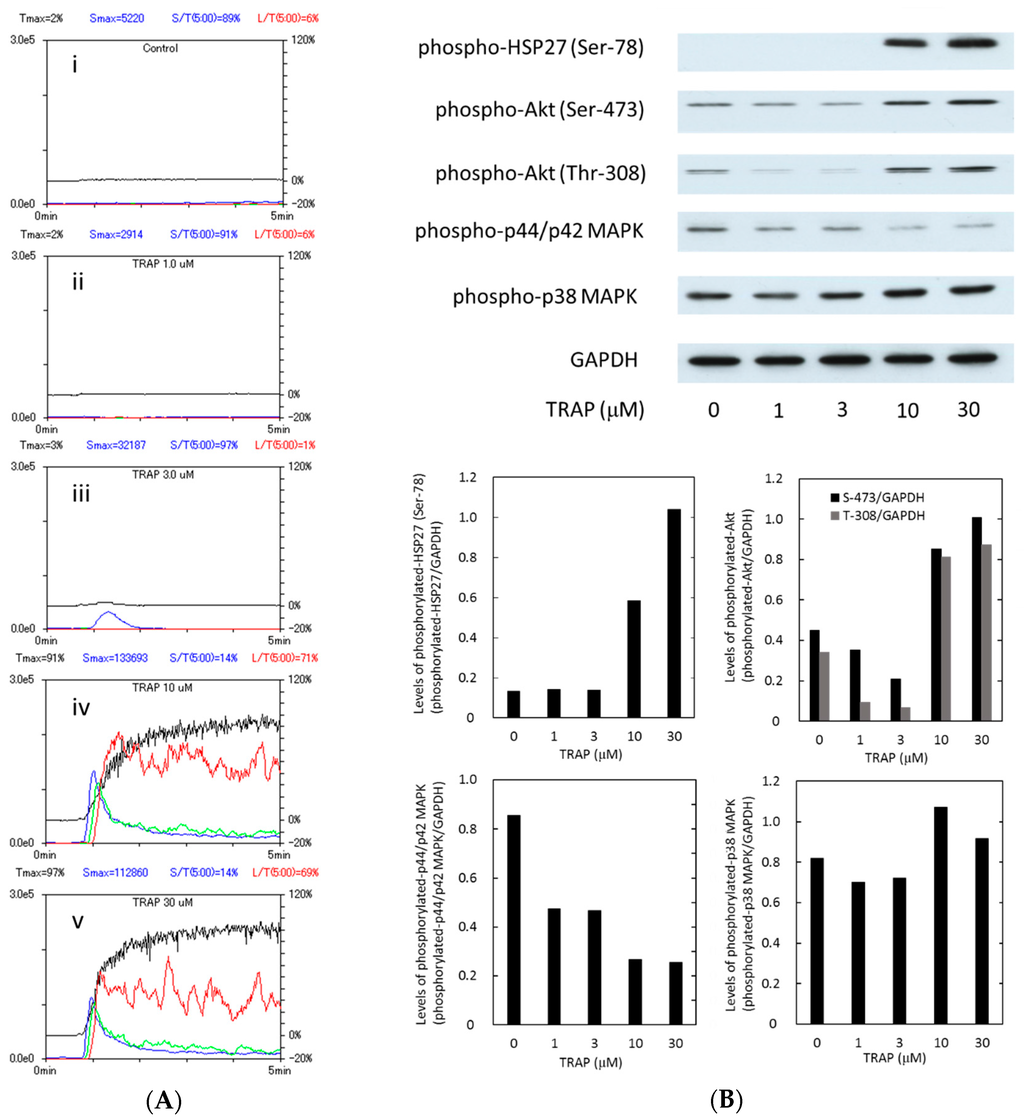 Human HSP27 is phosphorylated at three residues of serine (Ser-15, Ser-78 and Ser-82) [,]. In our previous study [], we have demonstrated that the levels of HSP27 phosphorylation at Ser-78 by collagen are significantly correlated with the levels of released phosphorylated-HSP27 in human platelets. Therefore, we examined the effects of TRAP on the phosphorylation of HSP27 (Ser-78). TRAP remarkably stimulated the phosphorylation of HSP27 (Ser-78) over the range between 10 and 30 µM (Figure 1B). The levels of phosphorylated-HSP27 seem to be directly proportional to the platelet aggregation.